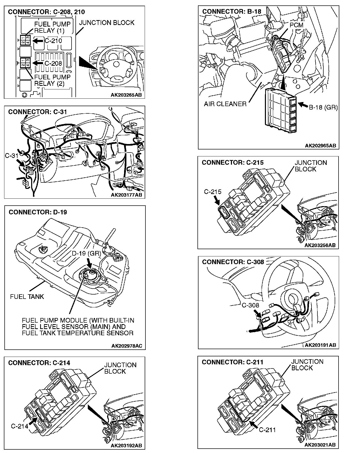 STEP 2. Check harness connector C-210 at fuel pump relay 1 and harness connector C-208 at fuel pump relay 2 for damage.