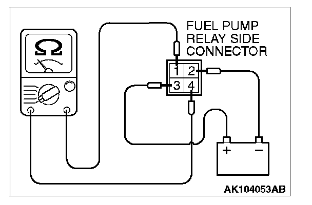 4. Check for continuity between the each fuel pump relay terminals No. 1 and No. 4 while connecting and disconnecting the jumper wire at the negative battery terminal.