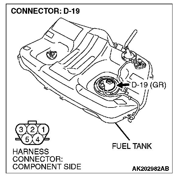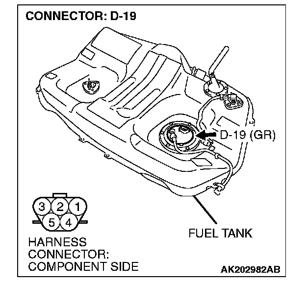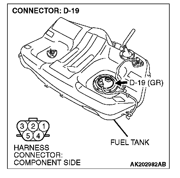 STEP 11. Check for continuity at fuel pump harness side connector D-19.