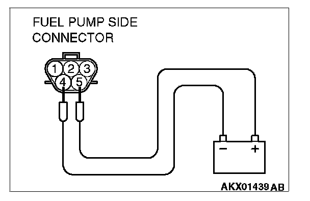 2. Use jumper wires to connect fuel pump connector terminal No. 5 to the positive battery terminal and terminal No. 4 to the negative battery terminal.