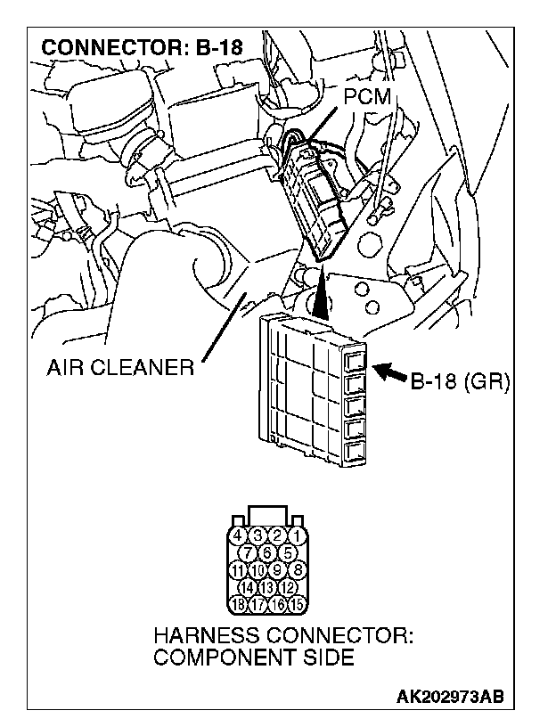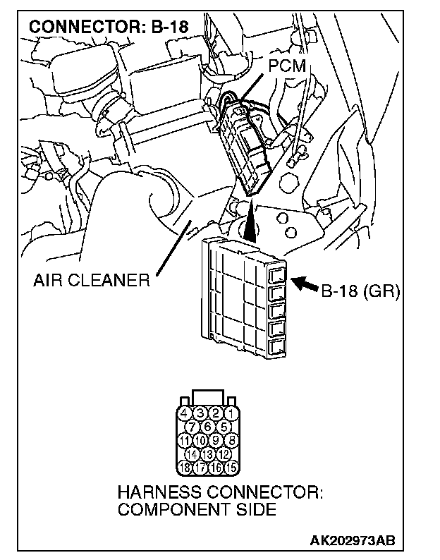 STEP 13. Check harness connector B-18 at PCM for damage.