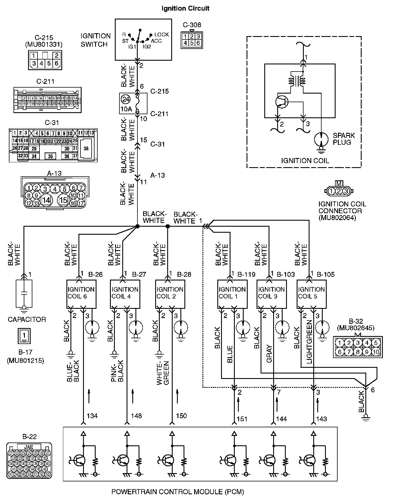STEP 4. Check for open circuit between ignition switch connector C-308 (terminal No. 2) and ignition coil connectors B-26, B-27, B-28, B-103, B-105, B-119 (terminal No. 1).