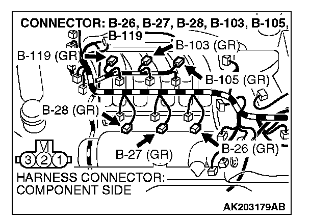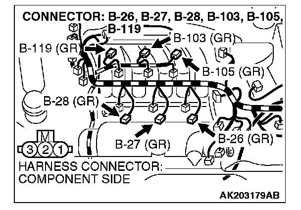 1. Disconnect the connector B-26, B-27, B-28, B-103, B-105, B-119 and measure at the harness side.