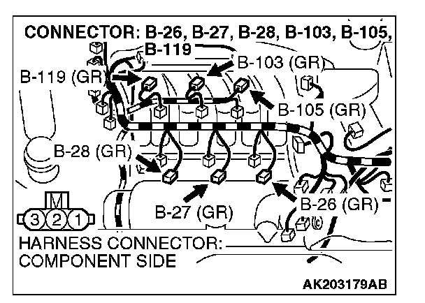 STEP 5. Check the circuit at ignition coil harness side connectors B-26, B-27, B-28, B-103, B-105, B-119.