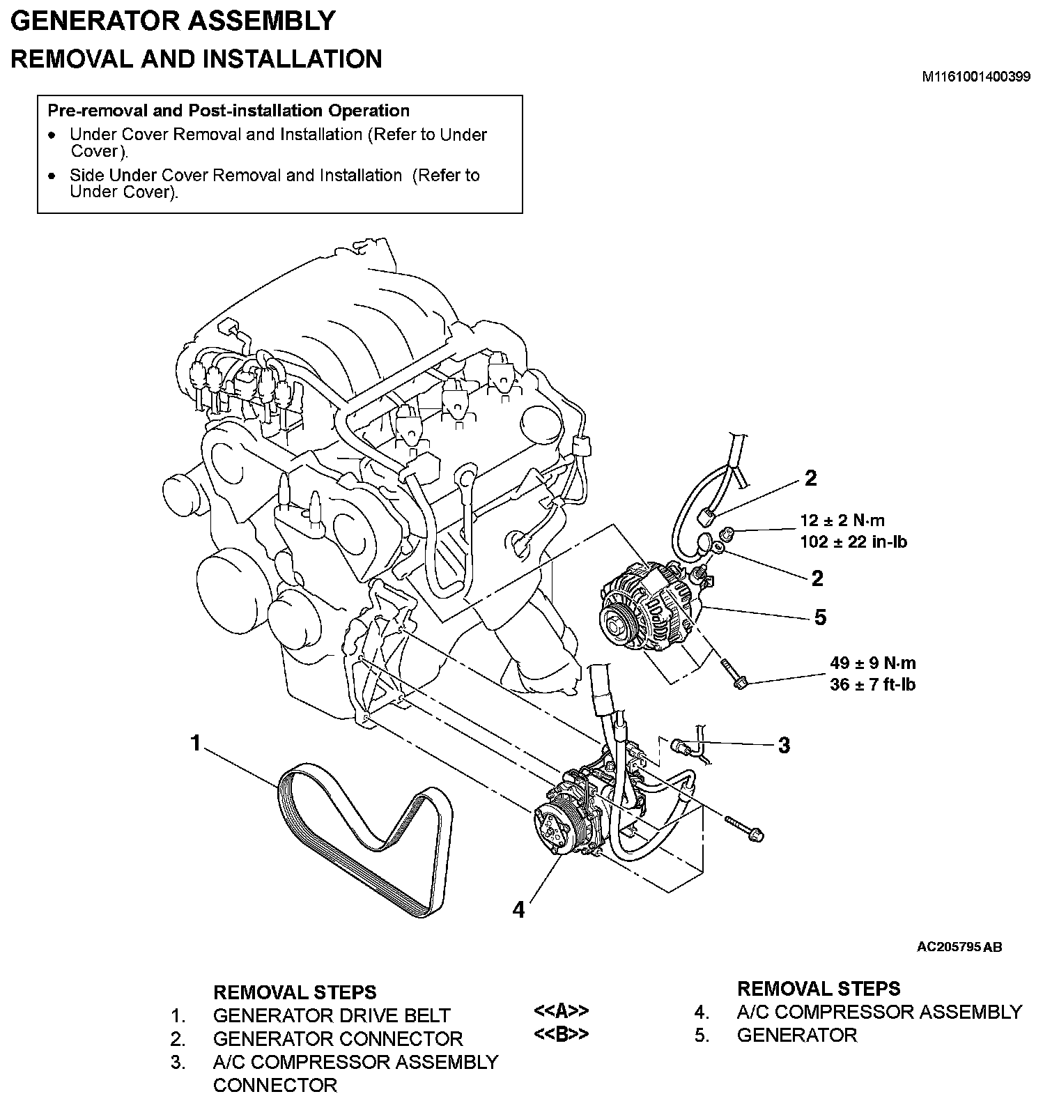 NOTE: Place the removed A/C compressor where it will not be a hindrance when removing and installing the generator, and secure it with a cord or wire.