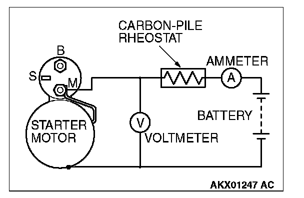 2. Connect a test ammeter (100-ampere scale) and carbon pile rheostat in series between the positive battery terminal and starter motor terminal.
