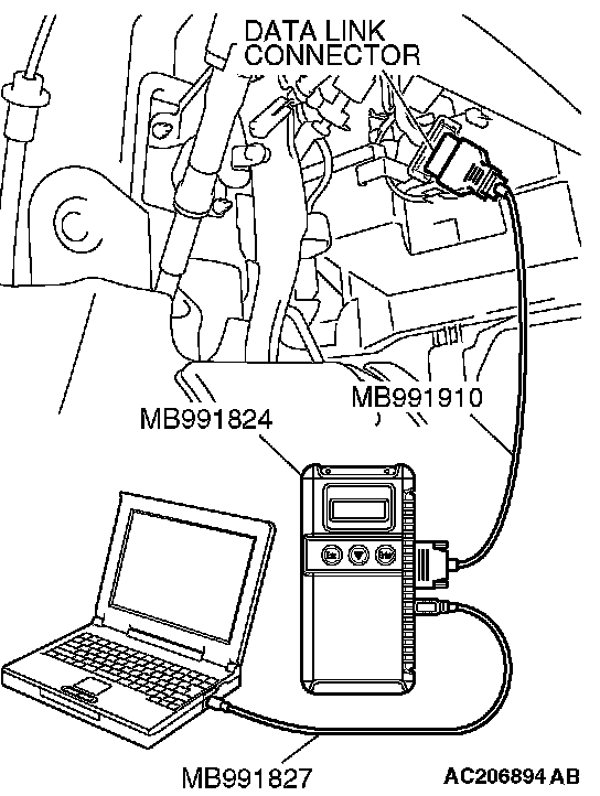 2. To prevent damage to scan tool MB991958, always turn the ignition switch to the "LOCK" (OFF) position before connecting or disconnecting scan tool MB991958.