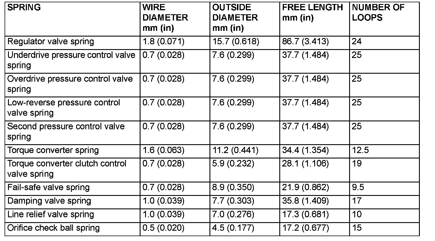 Valve Body Spring Identification Table