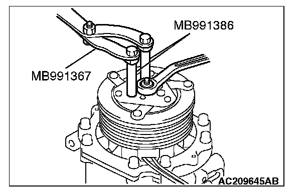 Apply voltage from the battery to the air conditioning compressor clutch and check that the clutch air gap is inside the standard value. If outside the standard value, use a shim to adjust the gap.