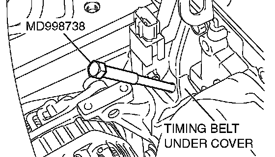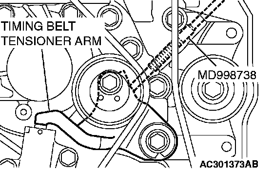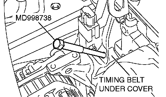 CAUTION: Special tool MD998738 can be gradually installed at a rate of a 30 degree turn per second. If it is screwed in all at once, the timing belt tensioner adjuster rod will not easily retract and special tool MD998738 may bend.