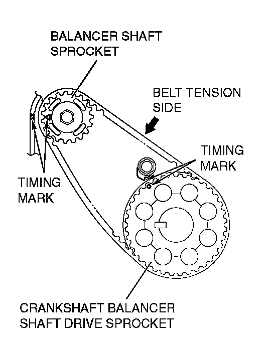 2. Install the balancer timing belt on the crankshaft balancer shaft drive sprocket and balancer shaft sprocket. There should be no slack on the tension side.