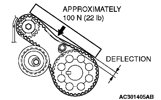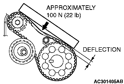 3. Apply a pressure of approximately 100 N (22 pounds) at the center (arrow area) between the sprocket as shown in the figure, then inspect whether the belt deflection is within the standard value.