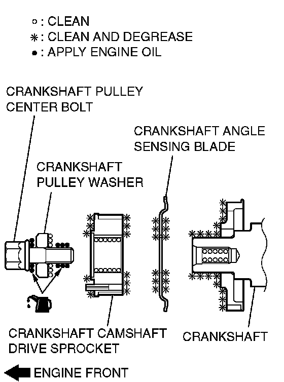 1. Clean or degrease the crankshaft, the crankshaft angle sensing blade, the crankshaft camshaft drive sprocket and crankshaft pulley washer as shown.