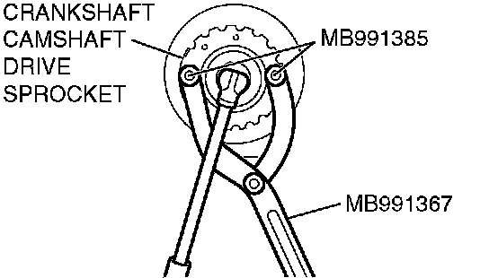 1. Hold the crankshaft camshaft drive sprocket with special tools MB991367 and MB991385.