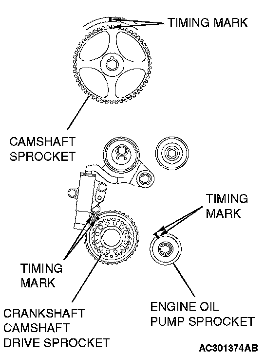 1. Align the timing marks on the camshaft sprocket, crankshaft camshaft drive sprocket and engine oil pump sprocket.