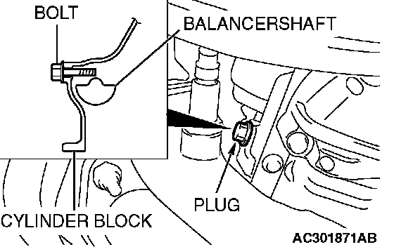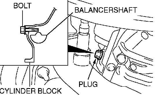 2. Adjust the timing mark of the engine oil pump sprocket. Unplug the cylinder block plug. Insert a bolt (M6, section width 10 mm, nominal length 45 mm) from the plug hole. If the bolt comes in contact with the balancer shaft, turn the engine oil sprocket one rotation. Re-adjust the timing mark and then check to see that the bolt fits. Do not remove the bolt until the valve timing belt is assembled.
