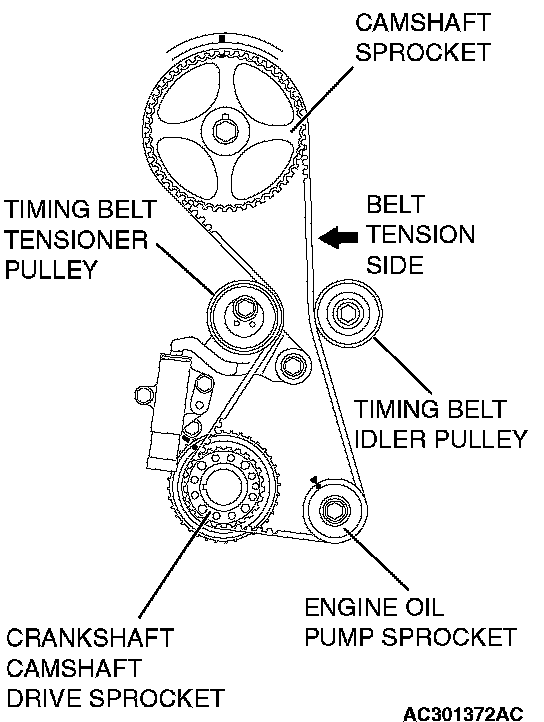 CAUTION: Incorporate the valve timing belt. Then apply reverse rotation (counterclockwise rotation) pressure to the cam shaft sprocket. Re-check to see that each timing mark is aligned while the tension side of the belt is right.