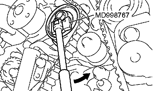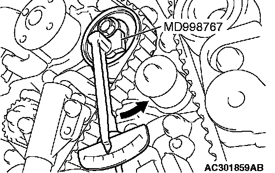 4. Turn the timing belt tensioner pulley in the direction shown in the figure using special tool MD998767 to apply tension to the valve timing belt. Then temporarily tighten and fix the timing belt tensioner pulley mounting bolt.