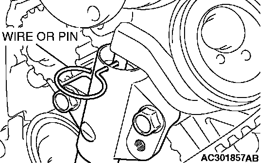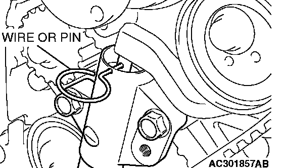 10. Insert wire or pin removed in Step 7 again, and ensure that it can be pulled out with a light load. When wire or pin can be lightly removed, appropriate tension is applied on timing belt. In this case, remove wire or pin.