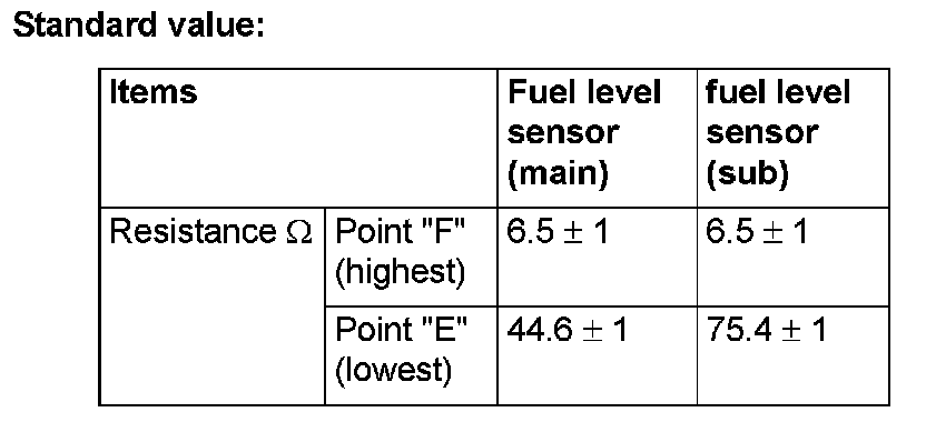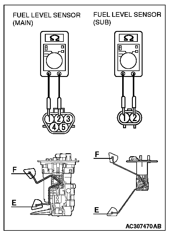 1. Check the resistances between fuel level sensor main terminals 1 and 2 as well as sub terminals 1 and 2 of the fuel pump module, respectively.