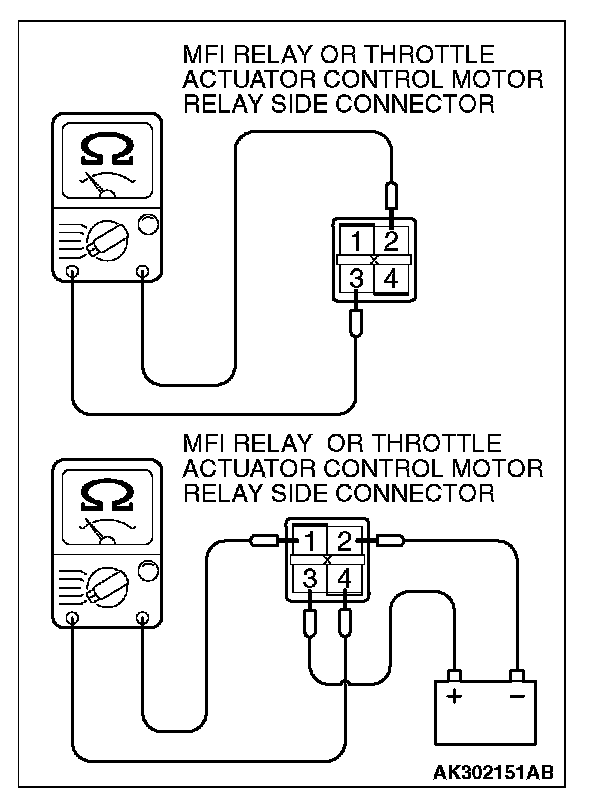 MULTIPORT FUEL INJECTION (MFI) RELAY AND THROTTLE ACTUATOR CONTROL MOTOR RELAY CONTINUITY CHECKInspect the MFI relay and throttle actuator control motor relay for continuity in accordance with the chart shown.