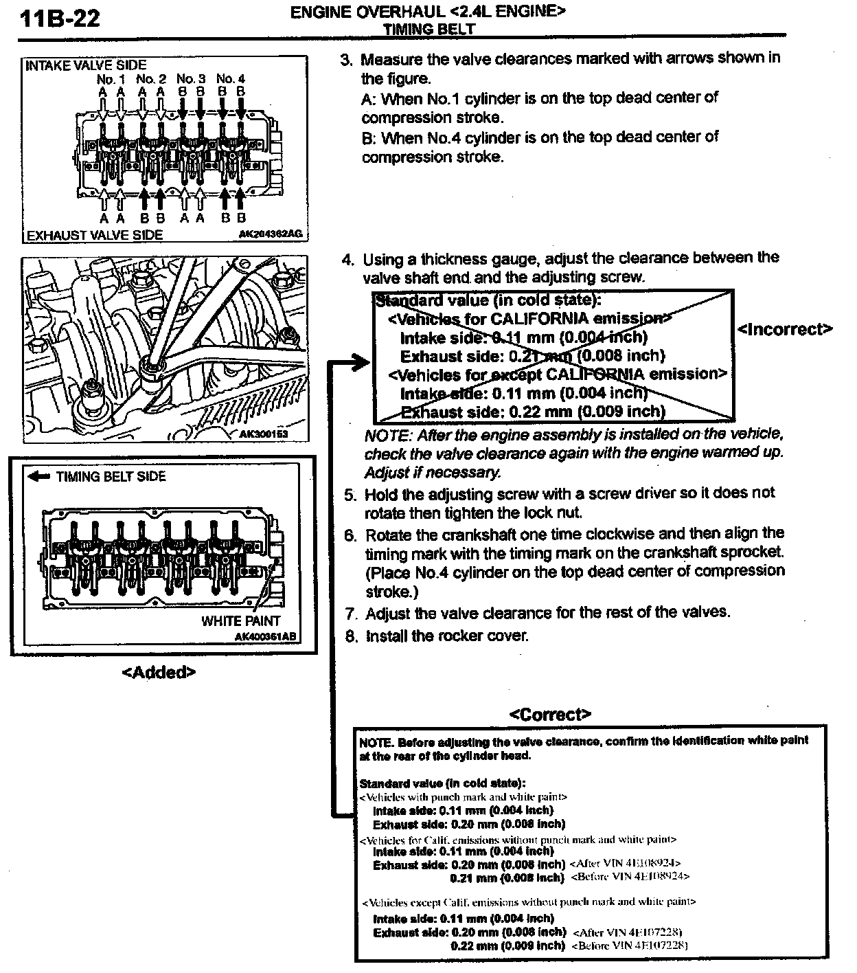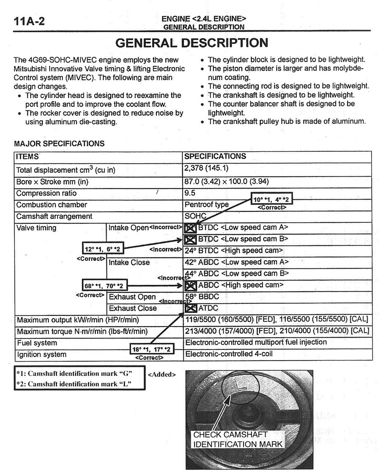 2004 Galant Service Manual, Volume 1, page 11A-2. Correct the valve timing specifications as shown.