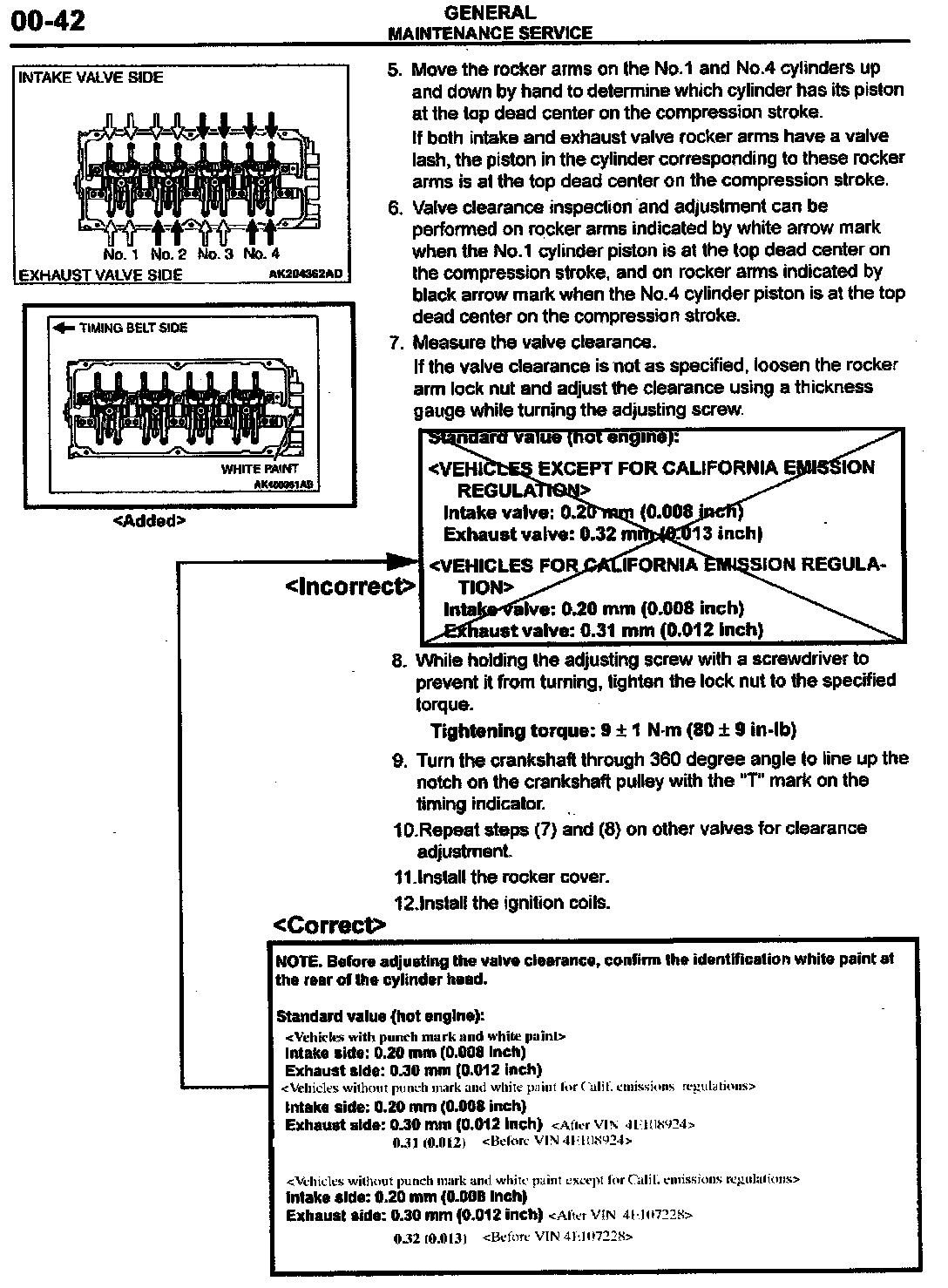 2004 Galant Service Manual, Volume 1, page 00-42. Correct the valve clearance standard value as shown.