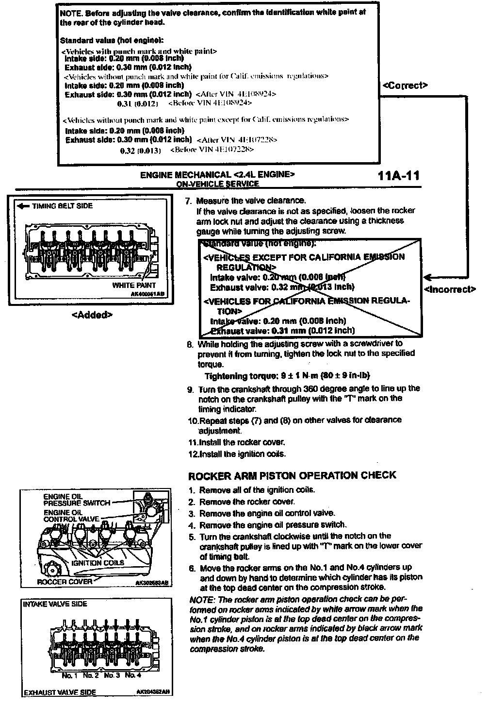 2004 Galant Service Manual, Volume 1, page 11A-11. Correct the valve clearance service specifications as shown.