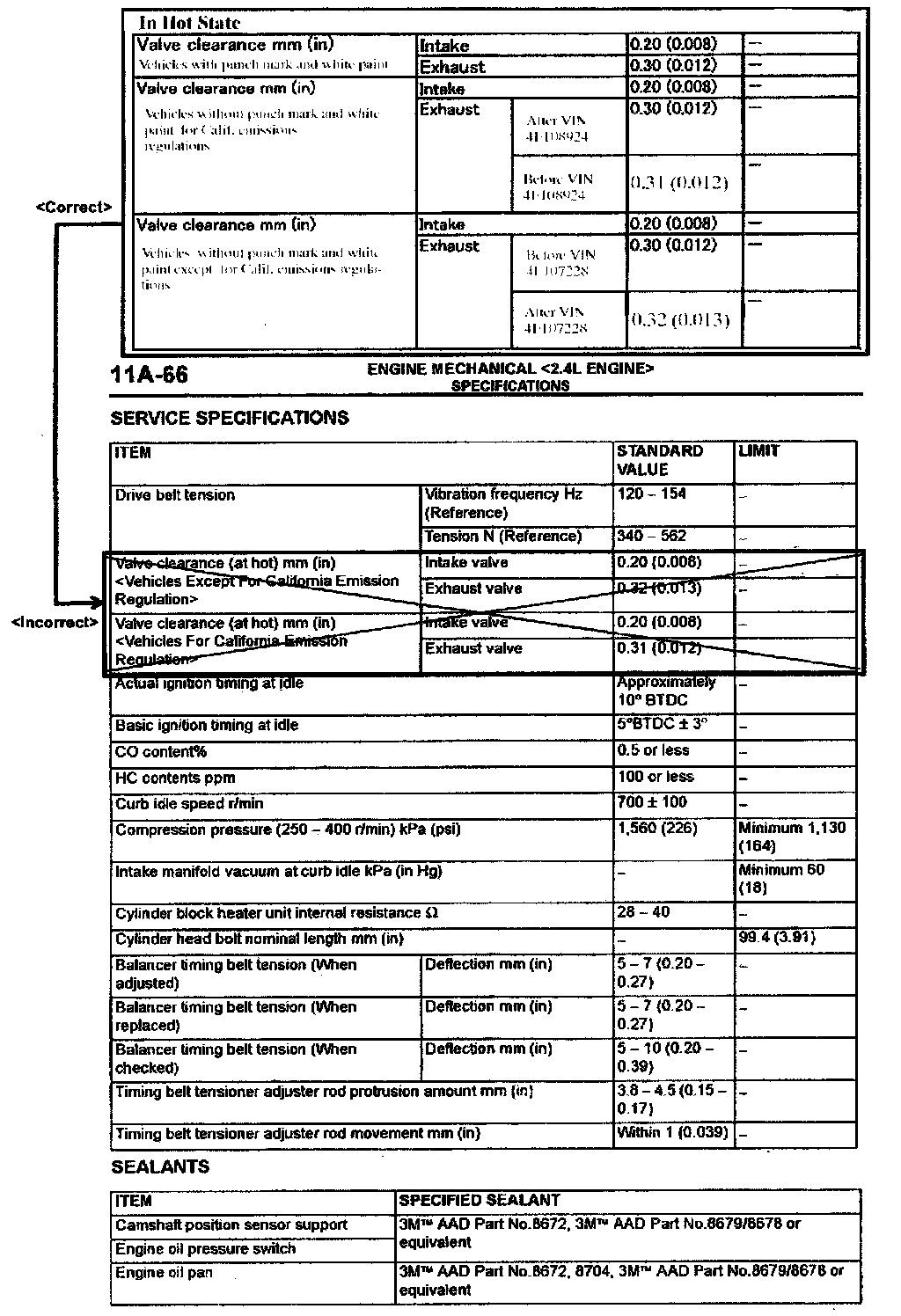 2004 Galant Service Manual Volume 1, page 11A-66. Correct the valve clearance service specifications as shown.