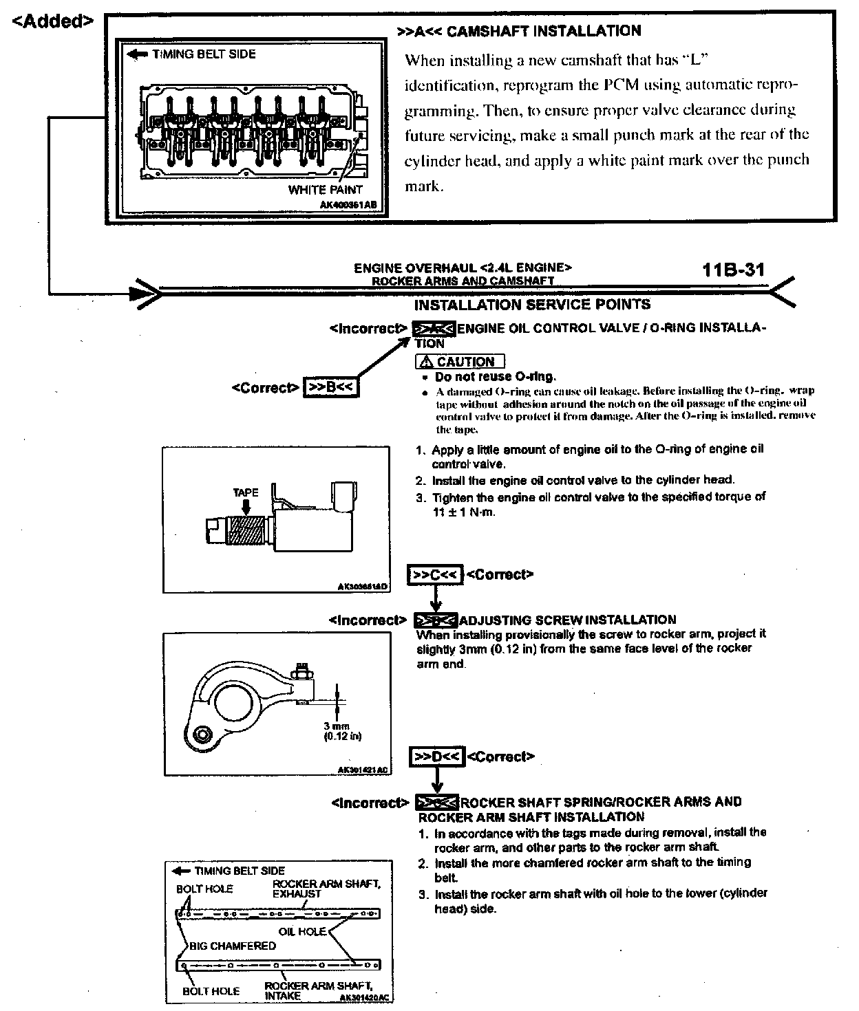 2004 Galant Service Manual, Volume 1, page 11B-31. Correct the camshaft installation procedures and installation service point indicators as shown.