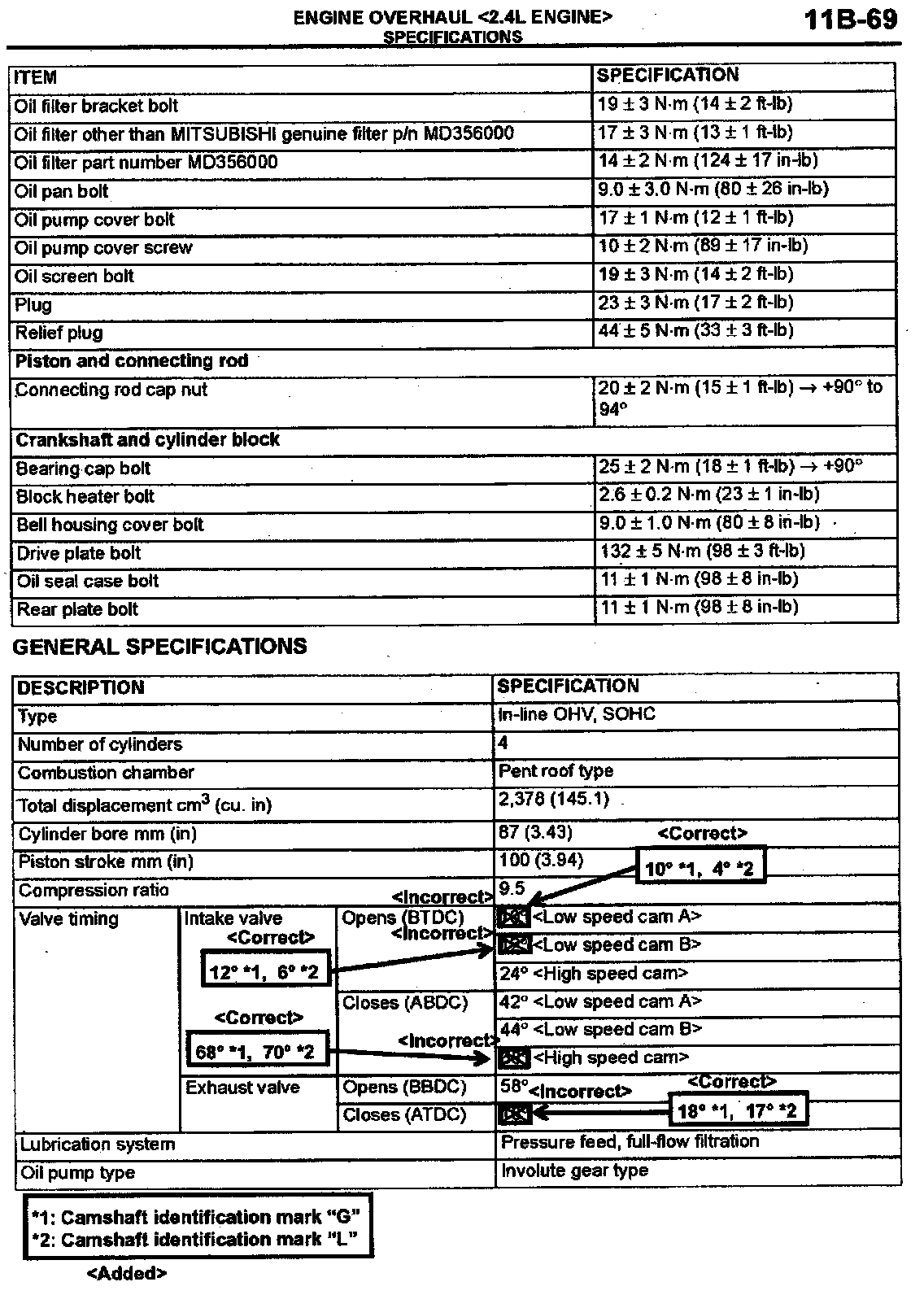 2004 Galant Service Manual, Volume 1, page 11B-69. Correct the valve timing specifications as shown.