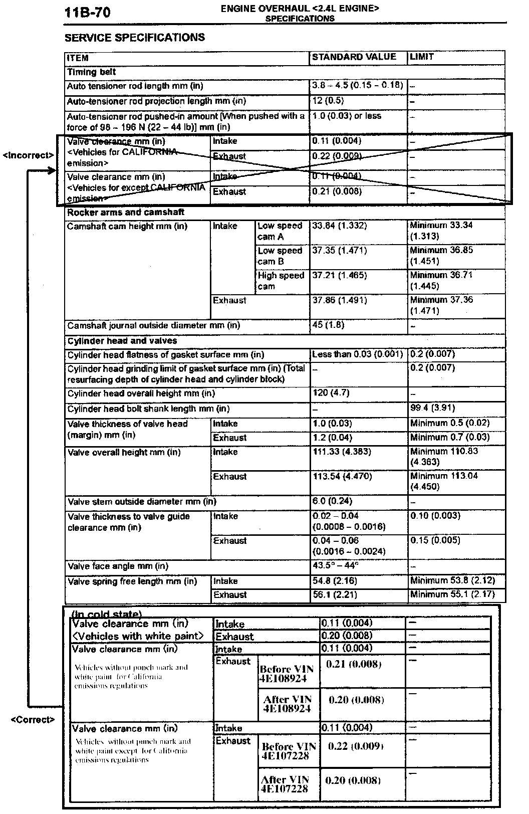 2004 Galant Service Manual, Volume 1, page 11B-70. Correct the valve clearance service specifications as shown.