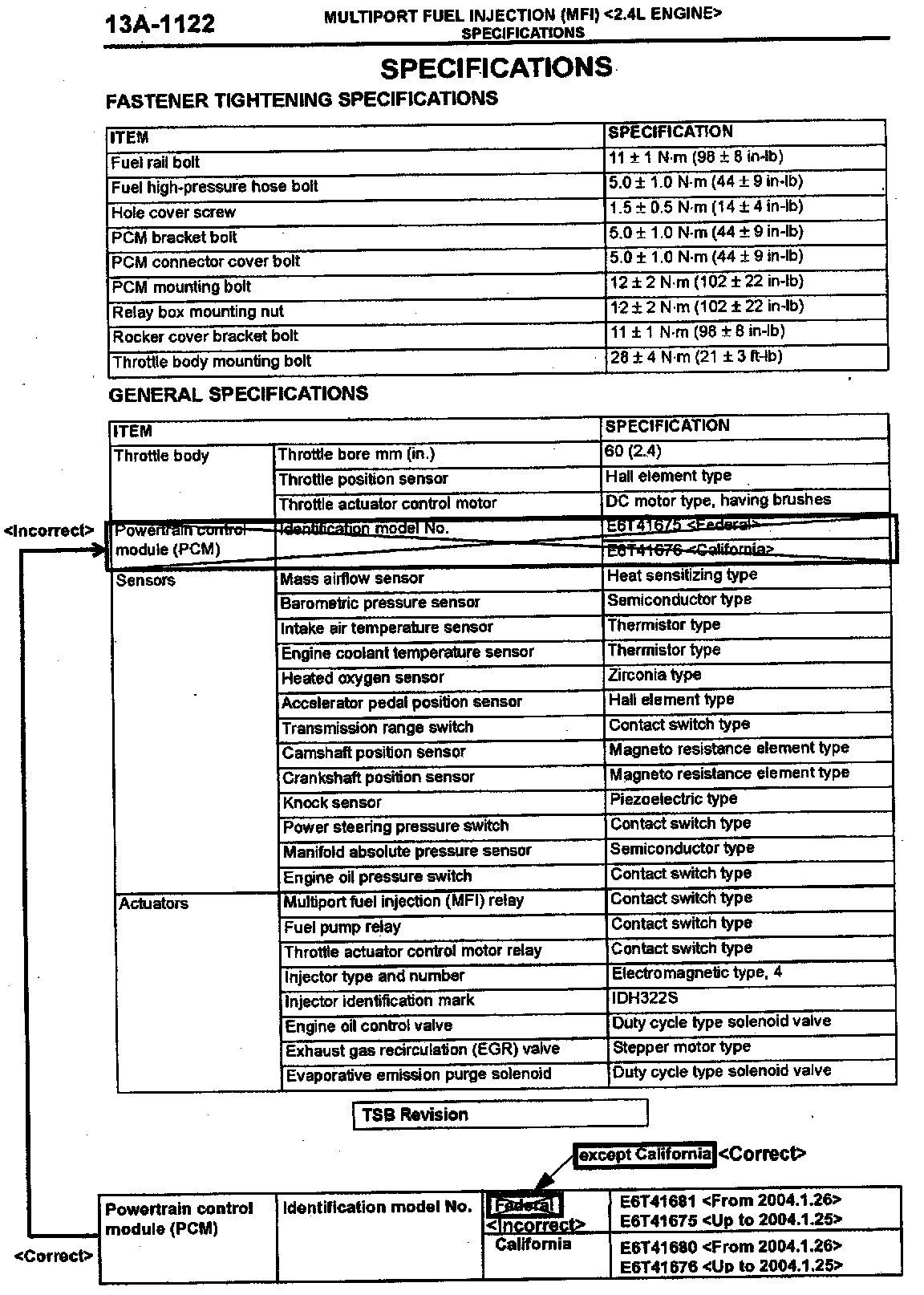 2004 Galant Service Manual, Volume 1, page 13A-1122. Correct the PCM identification information as shown.