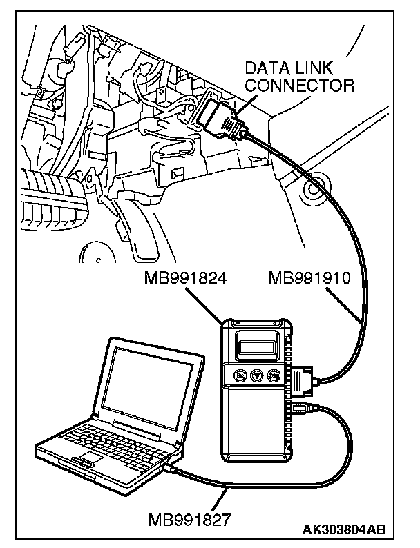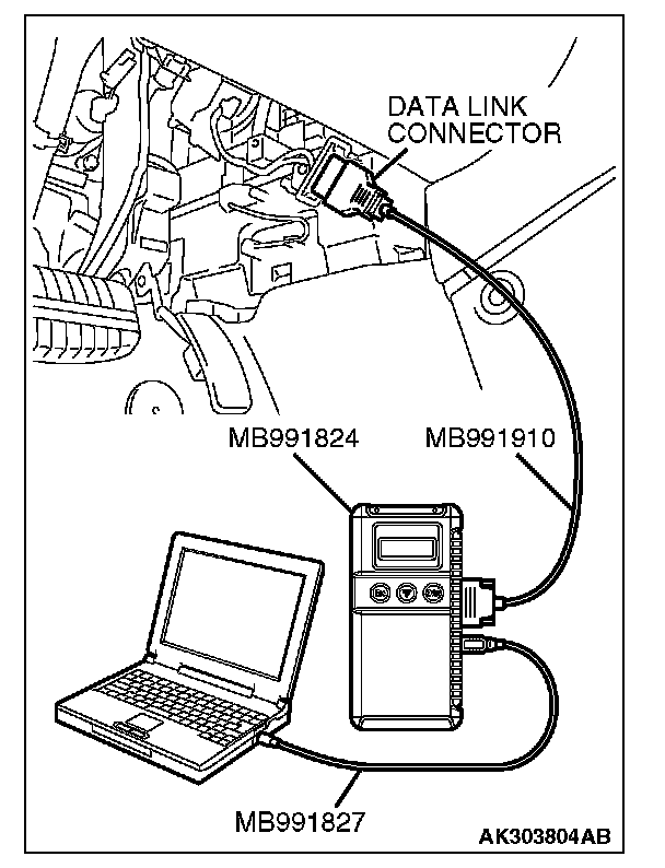 CAUTION: To prevent damage to scan tool MB991958, always turn the ignition switch to the "LOCK" (OFF) position before connecting or disconnecting scan tool MB991958.