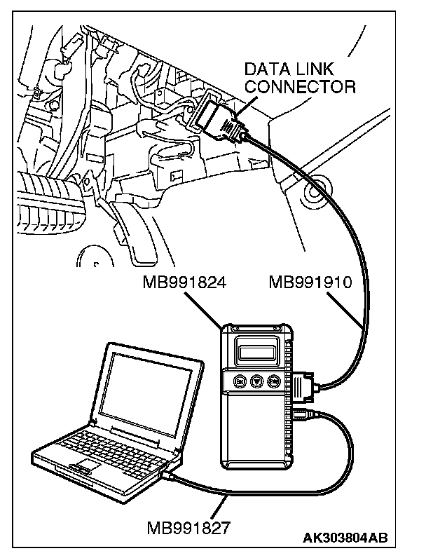 CAUTION: To prevent damage to scan tool MB991958, always turn the ignition switch to the "LOCK" (OFF) position before connecting or disconnecting scan tool MB991958.