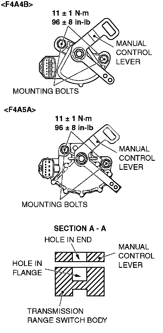 NOTE: The transmission range switch body can be aligned by inserting a 5-mm diameter steel bar into the end hole of the manual control lever and the flange hole of the transmission range switch body.