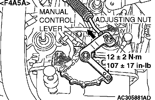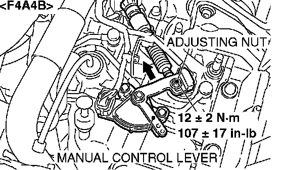 6. Gently push the transaxle control cable in the direction of the arrow, until the cable is taut. Tighten the adjusting nut.