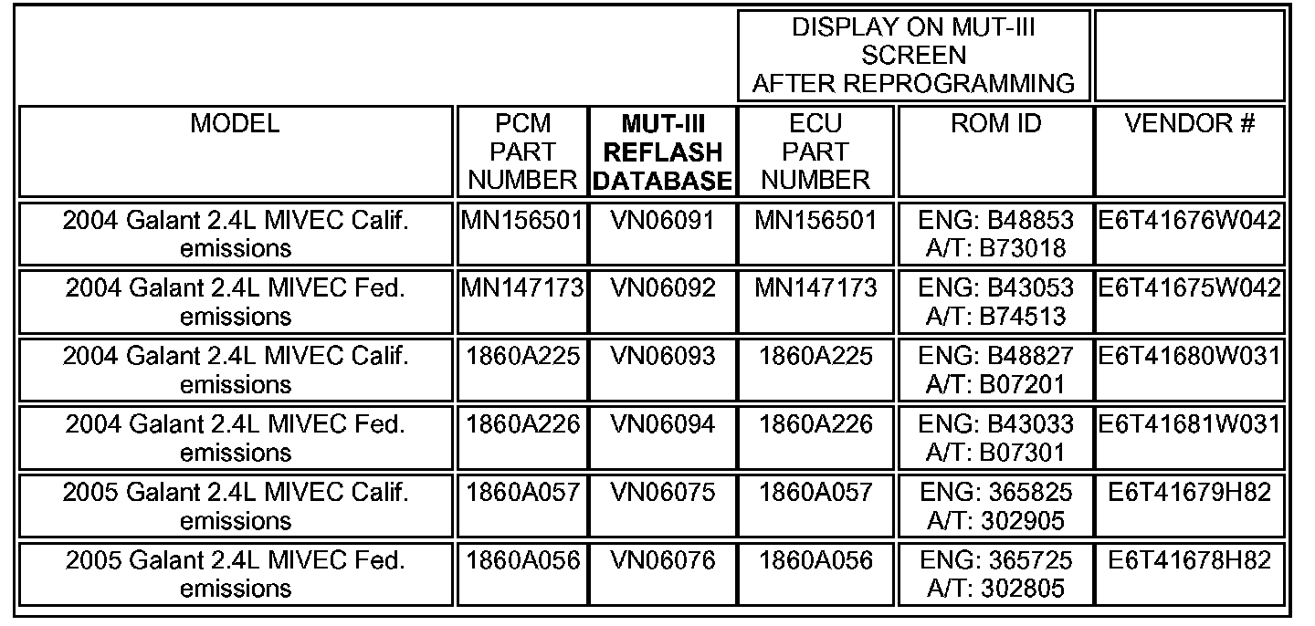 2. Using the MUT-III, verify that the vehicle's ECU part number is listed in the table in Step 7.