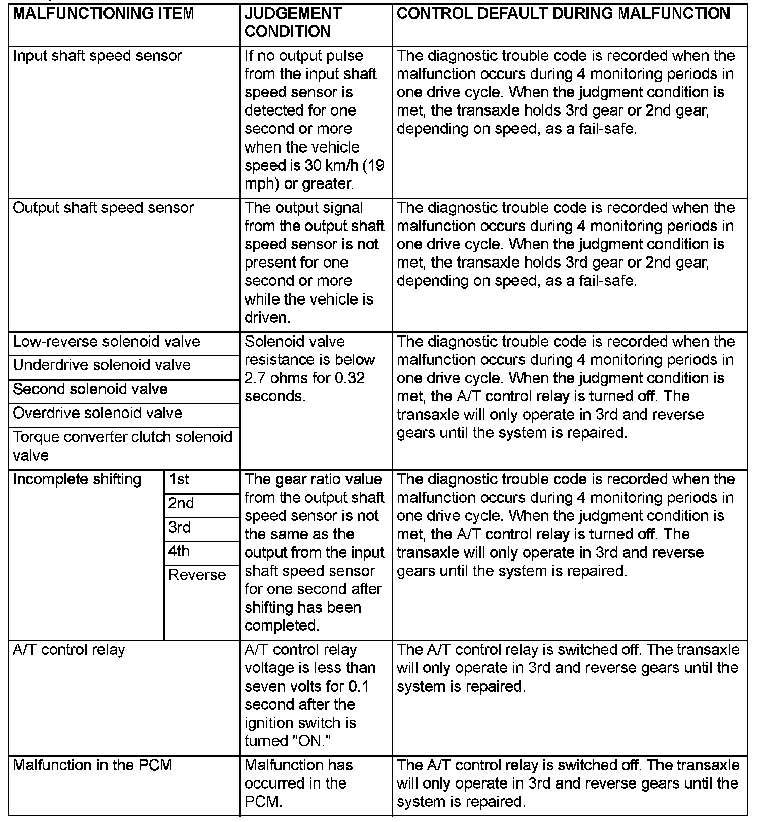 FAIL-SAFE/BACKUP FUNCTIONWhen a malfunction of a main sensor or actuator is detected by the PCM, the transaxle is controlled by preset control logic to maintain safe conditions for driving.
