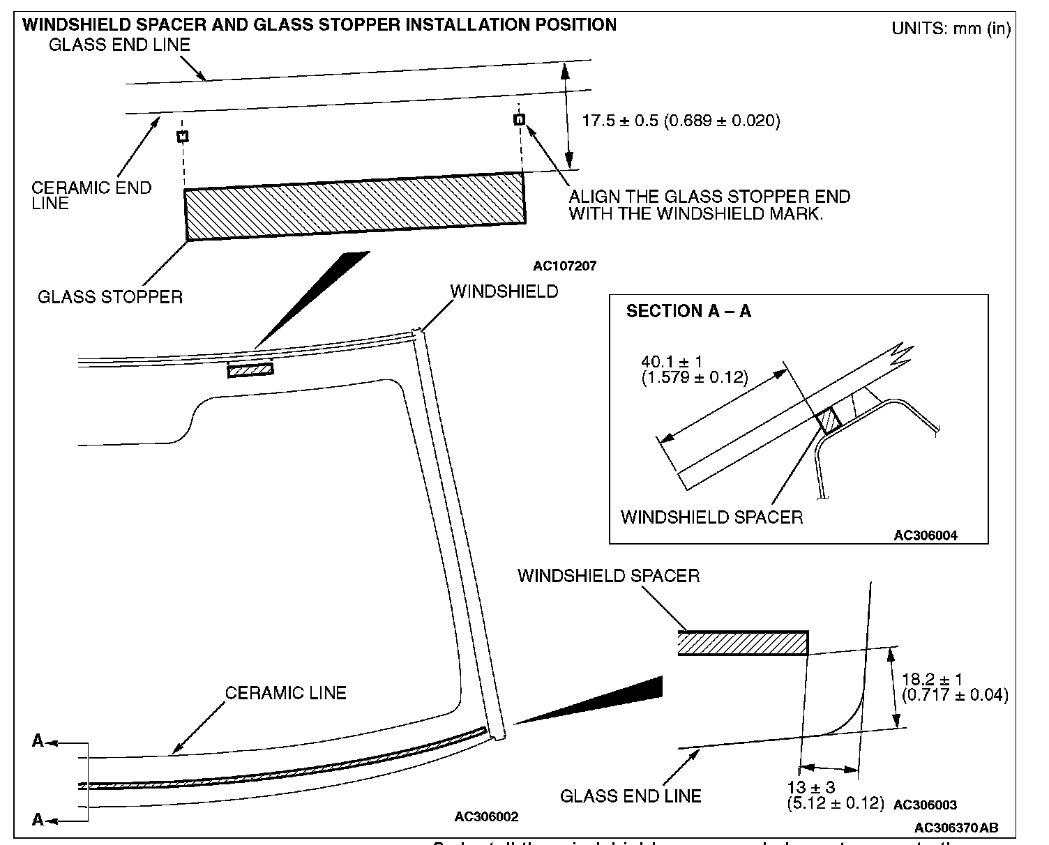 2. Install the windshield spacer and glass stoppers to the specified positions so that there are no adrift or warped surfaces inside the windshield.