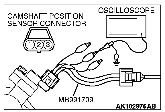 1. Disconnect the camshaft position sensor connector, and connect the test harness special tool (MB991709) between the separated connector (All terminals should be connected).