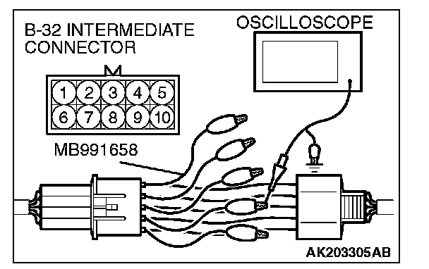 1. Disconnect the intermediate connector B-32, and connect the test harness special tool (MB991658) between the separated connector.