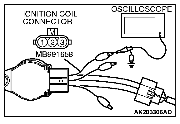 1. Disconnect the ignition coil connector, and connect test harness special tool (MB991658) between the separated connector (All terminals should be connected).