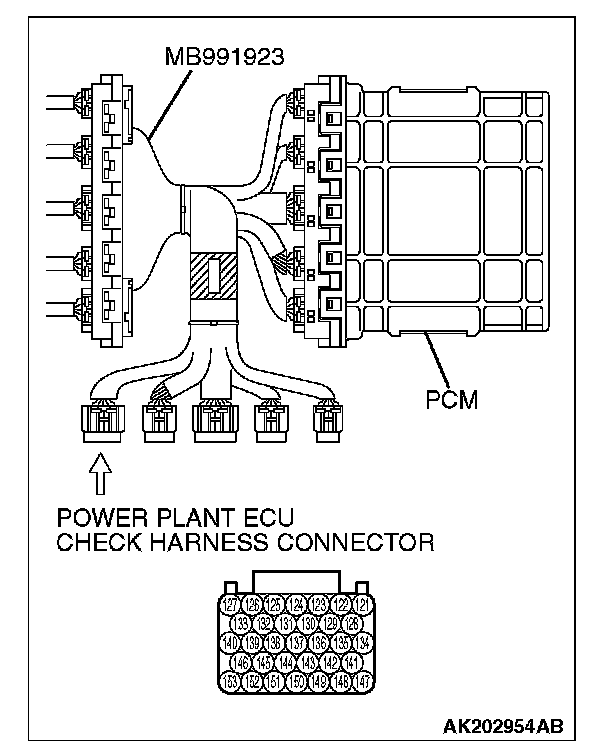 1. Disconnect the all PCM connectors, and connect check harness special tool (MB991923) between the separated connectors.