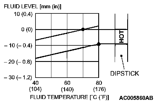 12. Drive the vehicle until the transmission fluid temperature rises to the normal operating temperature [70 - 80°C (158 - 176°F)], and then check the transmission fluid level again. The transmission fluid level must be at the "HOT" mark.