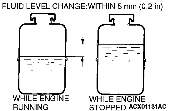 3. Check the fluid in the oil reservoir for foaming or milkiness. Check the difference of the fluid level when the engine is stopped, and while it is running. If the change of the fluid level is 5 mm (0.2 inch) or more, air bleeding should be done.