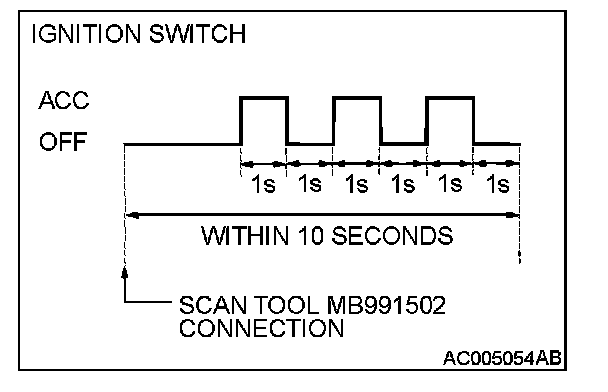 3. Within 10 seconds after connecting scan tool MB991502 turn the ignition switch to "ACC" for 1 second and then to "OFF" for 1 second; repeat this procedure three times.