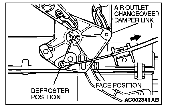 2. Set the air outlet changeover damper link of the heater unit to the defroster position as shown in the illustration, and then connect the cable to the link pin.