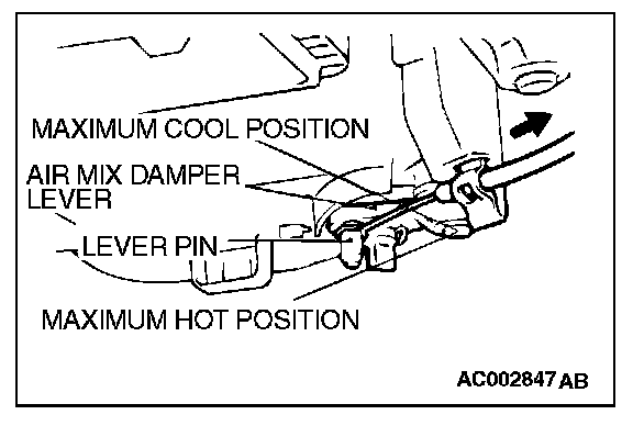 5. Set the air mix damper lever of the heater unit to the maximum hot position as shown in the illustration, and then connect the cable to the lever pin.
