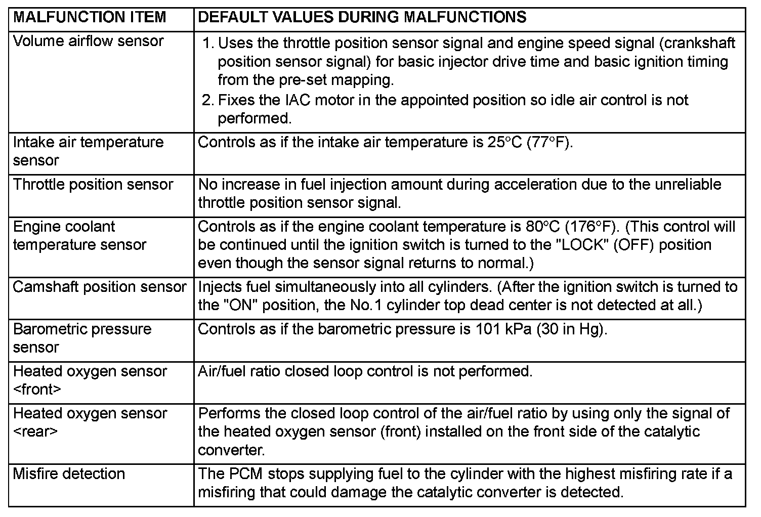 When the main sensor malfunctions are detected by the diagnostic test mode, the vehicle is controlled by means of the given defaults.